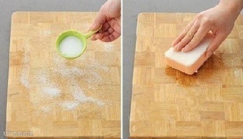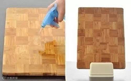 案板不好清洗?先用洗洁精和清水把案板清洗干净,然后在案板上撒一勺盐,用洗碗海绵蘸一点点水后,反复擦拭案板的表面,然后用冷水冲洗干净。再将白醋和水以1:2的比例调好后倒入喷壶中,喷在案板的表面,然后放到通风的地方,自然风干即可。
