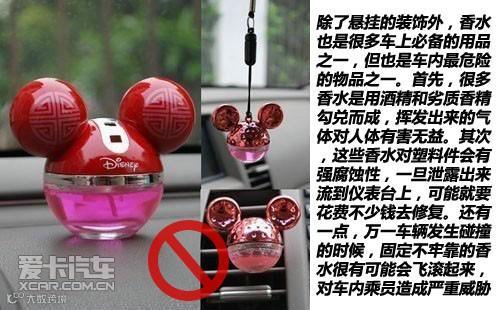 除了悬挂的装饰外,香水也是很多车上必备的用品之一,但也是车内最危险的物品之一。首先,很多香水是用酒精和劣质香精勾兑而成,挥发出来的气体对人体有害无益。其次,这些香水对塑料件会有强腐蚀性,一旦泄露出来流到仪表台上,可能就要花费不少钱去修复。还有一点,万一车辆发生碰撞的时候,固定不牢靠的香水很有可能会飞滚起来,对车内乘员造成严重威胁。所以,强烈建议大家不要在仪表台上放置这些瓶装的香水,如果想保持车内气味清新,其实还有很多更好的方法。例如我们完全可以不定期在车内喷洒一些自用的男士香水或女士香水,何必放个定时炸弹在仪表台上呢?