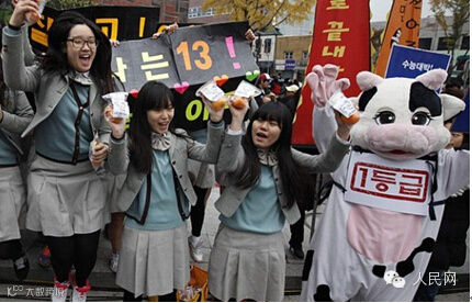 (韩国民众纷纷为考生加油打气,图为韩国高中生为参加高考的前辈加油。)