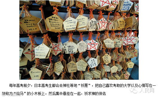 高考当天,考生大都身着黑色衣服。相比韩国家长,日本家长云集考场外情形很少见,来为考生加油的大多是补习班老师。为求取得好成绩,考生和家长热衷于拜庙求神,供奉“学问之神”的天满宫最受欢迎。