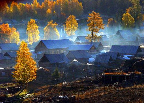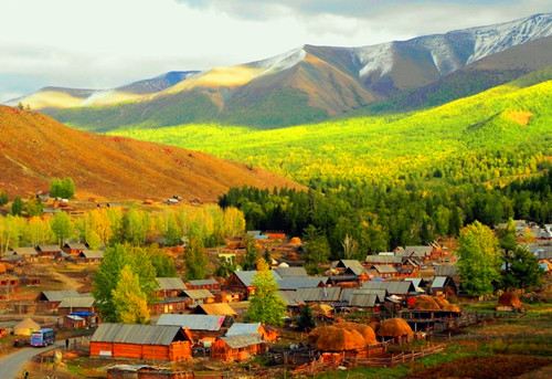 新疆喀纳斯图瓦村落是个秋色极美的村落,周围山青水秀。