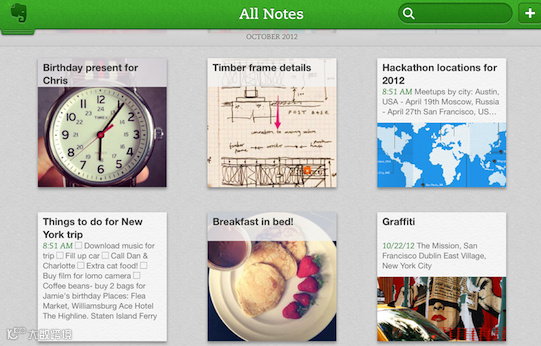 你也可以将记事归档,任何印象笔记中的信息都来自于不同的记事本。并且将这些记事通过Facebook或Twitter与其他人分享。在之后要想找到记事,你只需要回忆起关于它的一个关键点就可以了。例如,要想起一家去过的酒店?搜一下“法国吐司”,因为这是你在那家酒店吃过的,并且你还给菜单照了一张照片。
