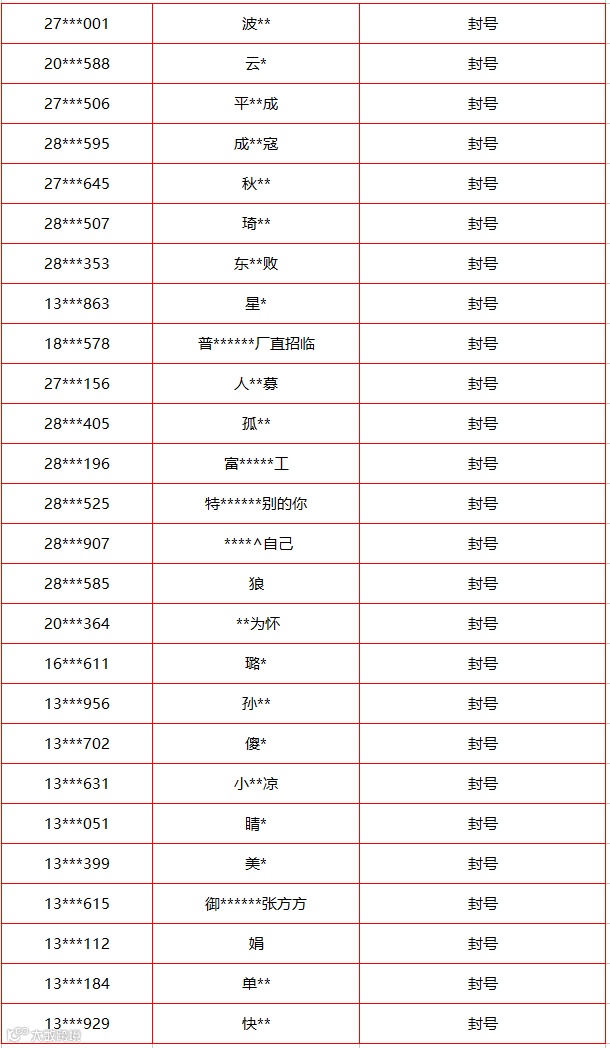 通过用户举报数据,为了维护绿色健康、公平的游戏环境,依据《游戏推广服务规则》、《用户协议》及国家互联网相关法规,我司游戏平台决定对以下玩家违规账号进行封号警告处罚。