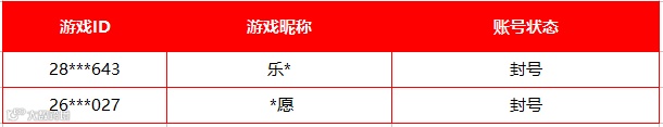 通过用户举报数据,为了维护绿色健康、公平的游戏环境,依据《游戏推广服务规则》、《用户协议》及国家互联网相关法规,我司游戏平台决定对以下玩家违规账号进行封号警告处罚。