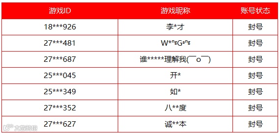 通过用户举报数据,为了维护绿色健康、公平的游戏环境,依据《游戏推广服务规则》、《用户协议》及国家互联网相关法规,我司游戏平台决定对以下玩家违规账号进行封号处罚。