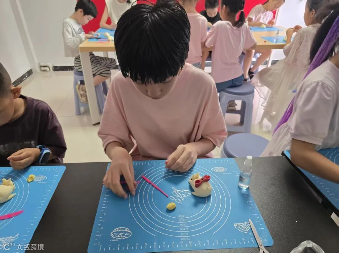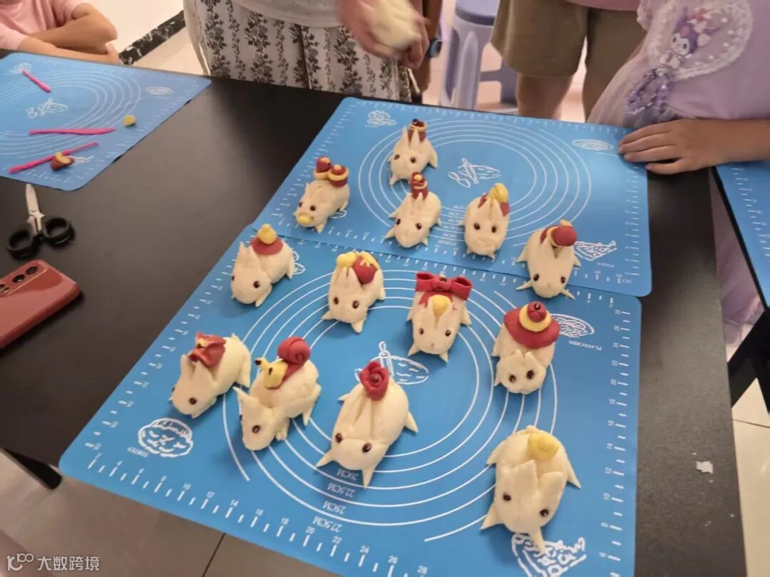 DIY环节,拿到黄色和红色面块的孩子们脑洞大开,有的在兔子背后捏了个金元宝,有的用红色面团给兔子做了个蝴蝶结发饰,还有的孩子别出心裁捏了只小蜗牛趴在兔子旁边。随后,孩子们举着自己的作品互相展示,工作人员拍照留念。
