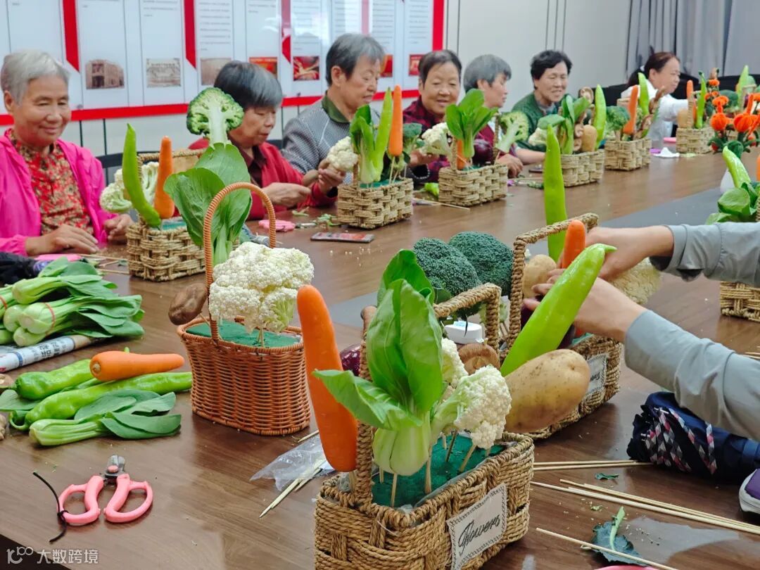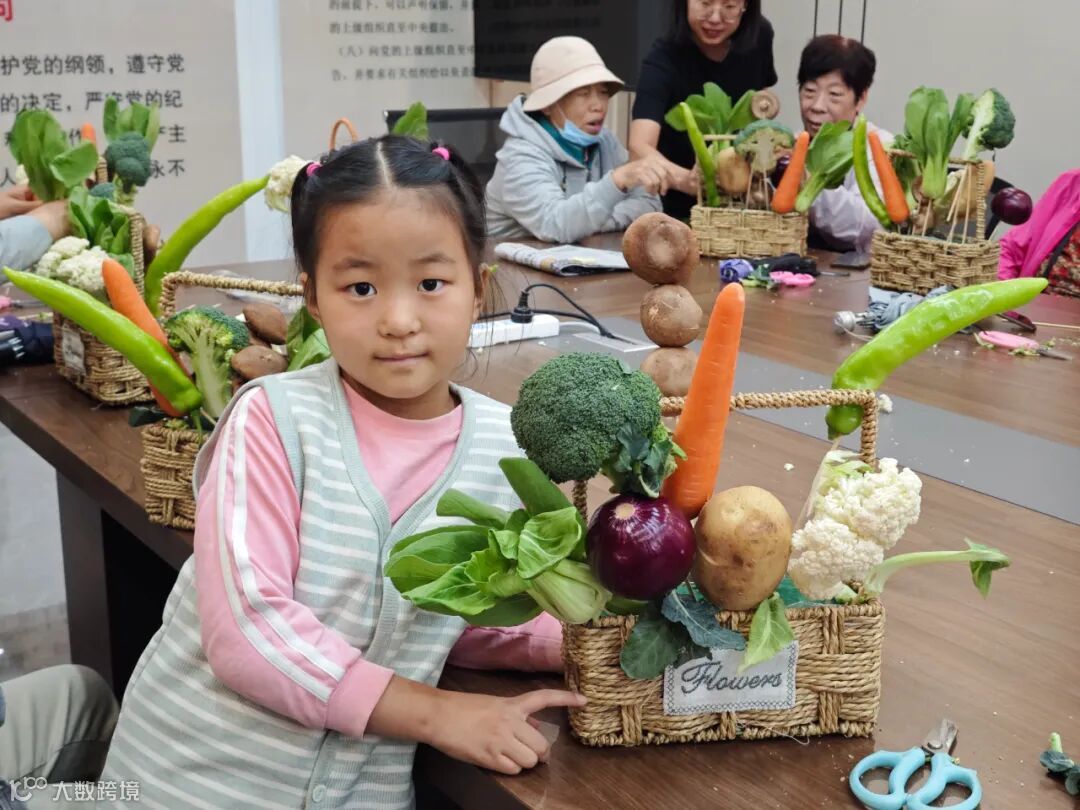 活动当天,社区活动室被装点成充满田园气息的创意空间。翠绿的西兰花、紫色的洋葱、橙色的胡萝卜…… 这些平日里端上餐桌的常见食材,此刻摇身一变,成为创意艺术的绝佳素材。