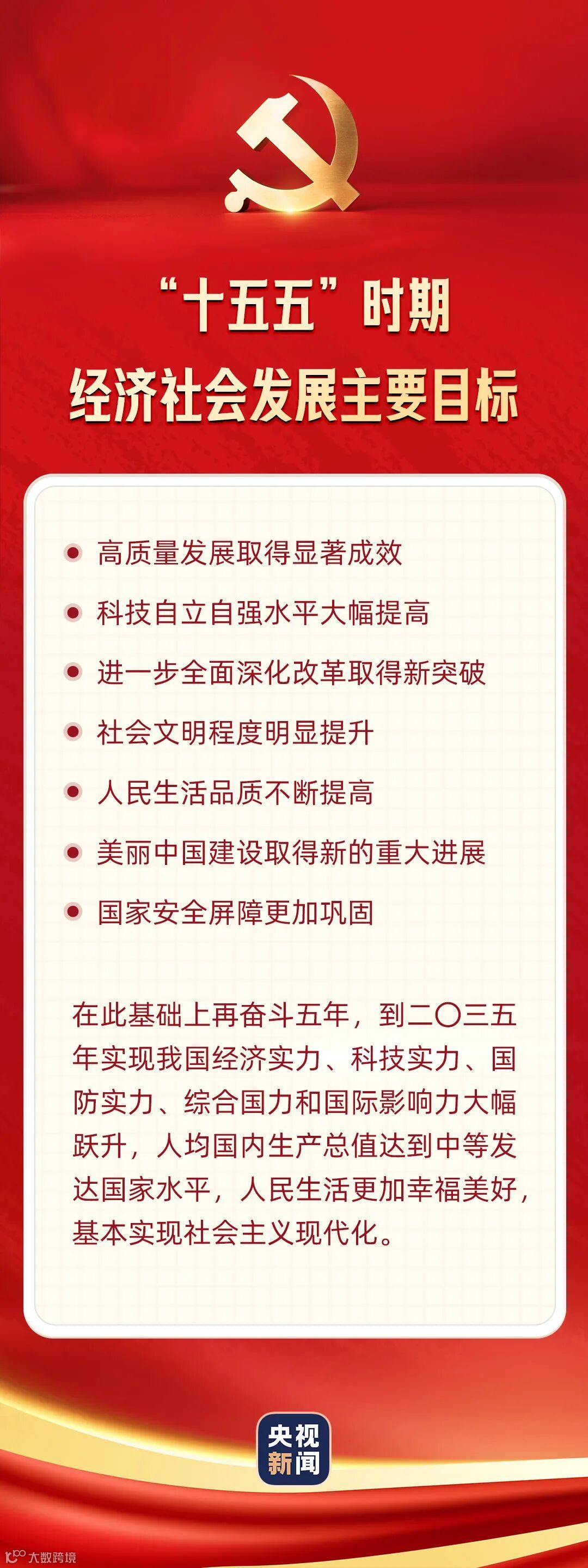 在此基础上再奋斗五年,到二〇三五年实现我国经济实力、科技实力、国防实力、综合国力和国际影响力大幅跃升,人均国内生产总值达到中等发达国家水平,人民生活更加幸福美好,基本实现社会主义现代化。