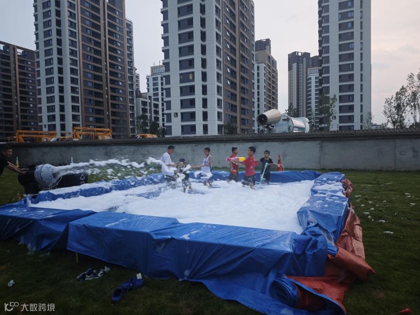 其中,最受小朋友们喜爱的当属“泡沫泳池”。巨型泡泡机源源不断地喷射出绵密雪白的泡沫,孩子们穿梭其间,时而追逐嬉戏,时而伸手捕捉飞舞的泡沫,笑声与欢呼声此起彼伏。每个人脸上都洋溢着纯真的笑容,夏日的燥热瞬间被驱散。