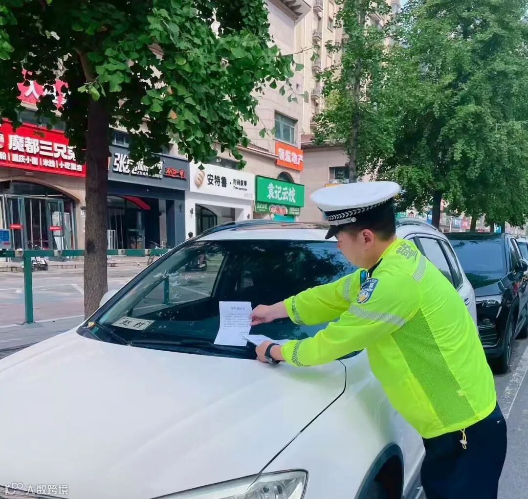 民警为车辆放置挪车通知书