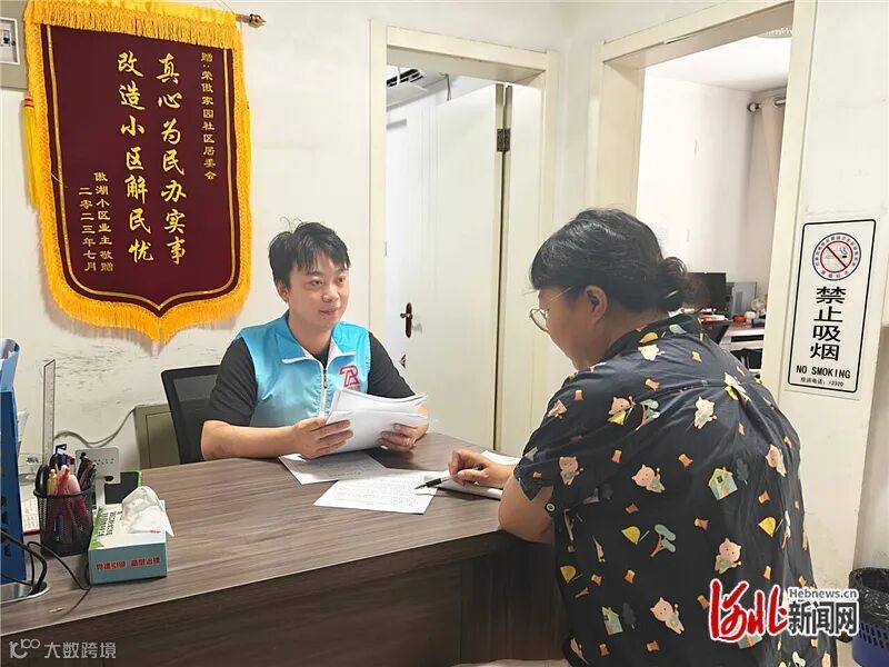7月10日,荣傲家园社区工作人员(左)倾听居民诉求。张思璇摄