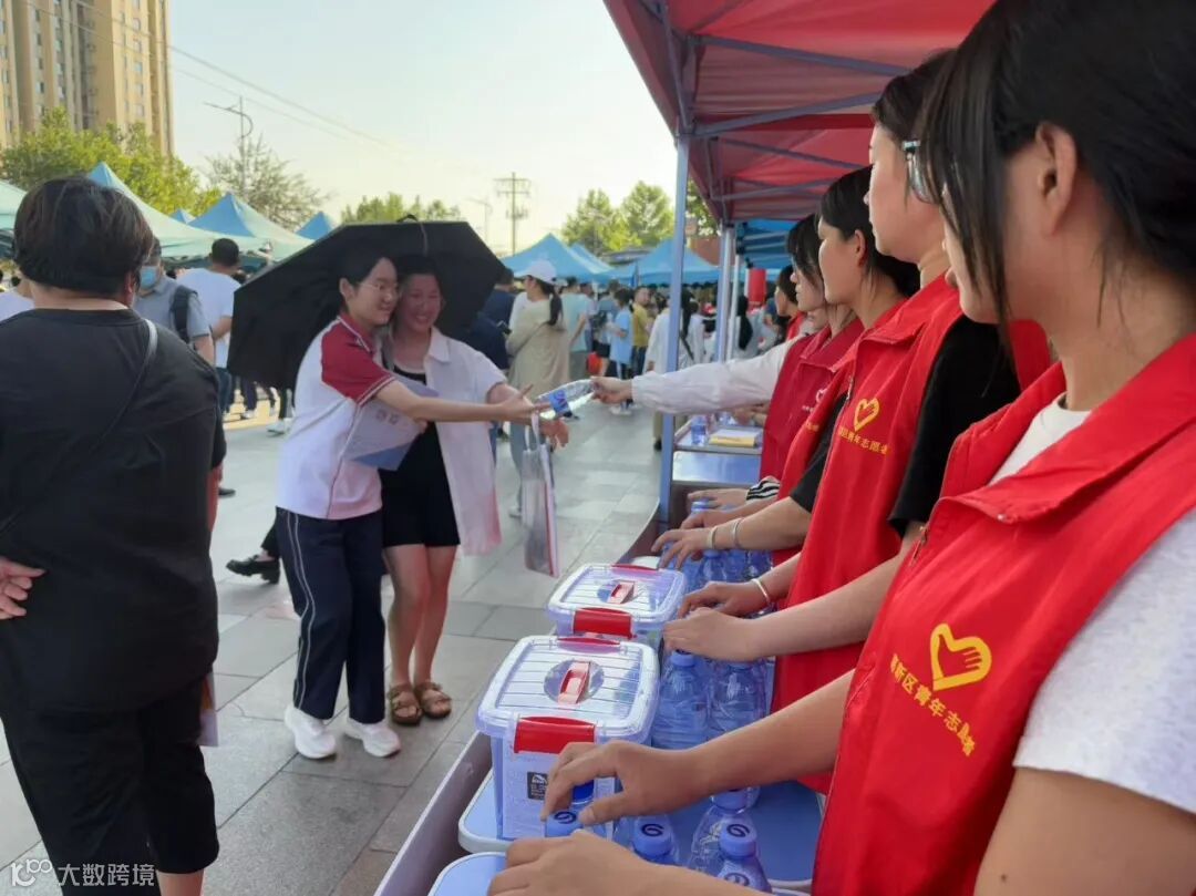 志愿者为考生和家长发放物资
