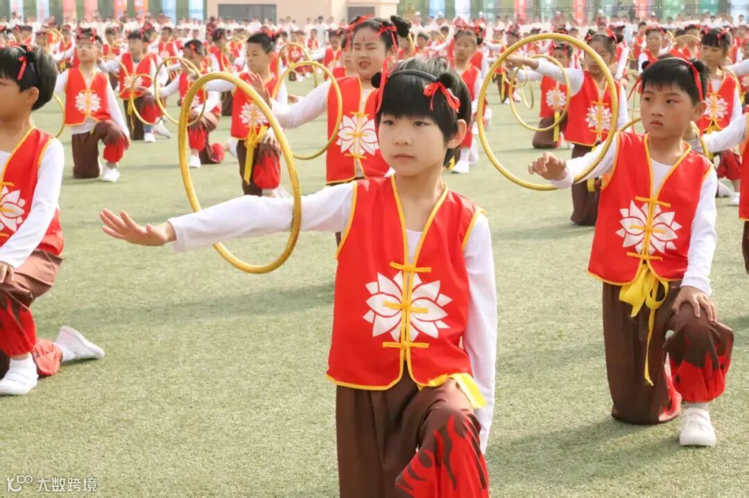 拉开了运动会的序幕,瀚林学校、第四小学、丘头小学、实验小学、昆仑大街小学2500余名学生进行了团体操展示。团体操融合了传统武术、扇子、足球、太极、呼啦圈等元素,形式多样、创意十足,充分展现了我区阳光体育大课间的活动特色与丰富成果。
