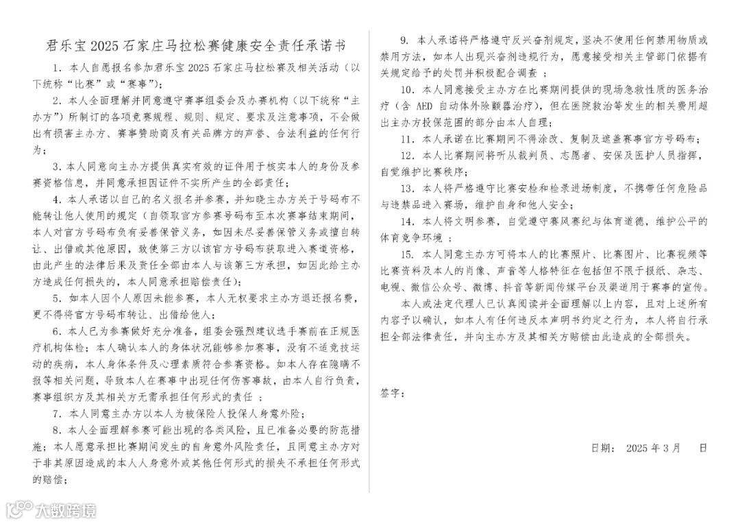 6. 参赛选手须在领取参赛物品时,请按照组委会要求,提交本人签署的《健康安全责任承诺书》;