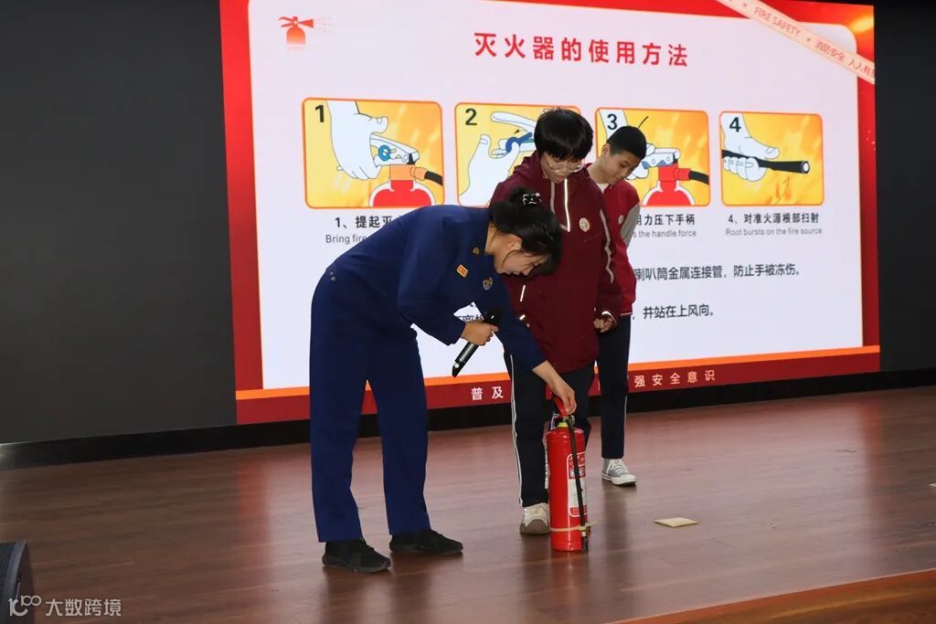近生活及校园实际,还详细讲解了消防栓作用及铺设方法,手把手教授灭火器的使用要领,通过现场互动的方式,让学生亲自学习操作灭火器的使用方法
