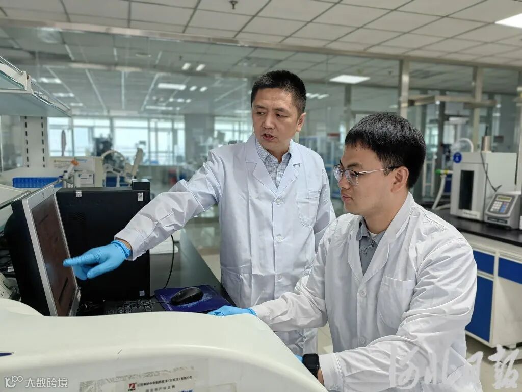 7月2日,石药集团研发与创新委员会石家庄研究院制剂研究一所所长李彦辉(左)和同事一起分析纳米脂质体粒度检测试验结果。河北日报记者冯阳摄