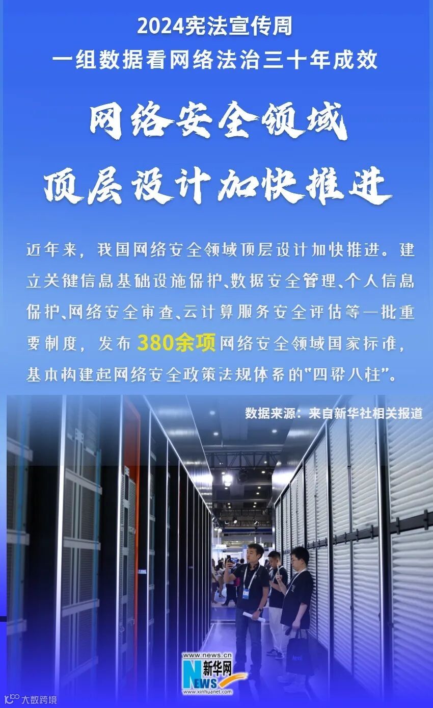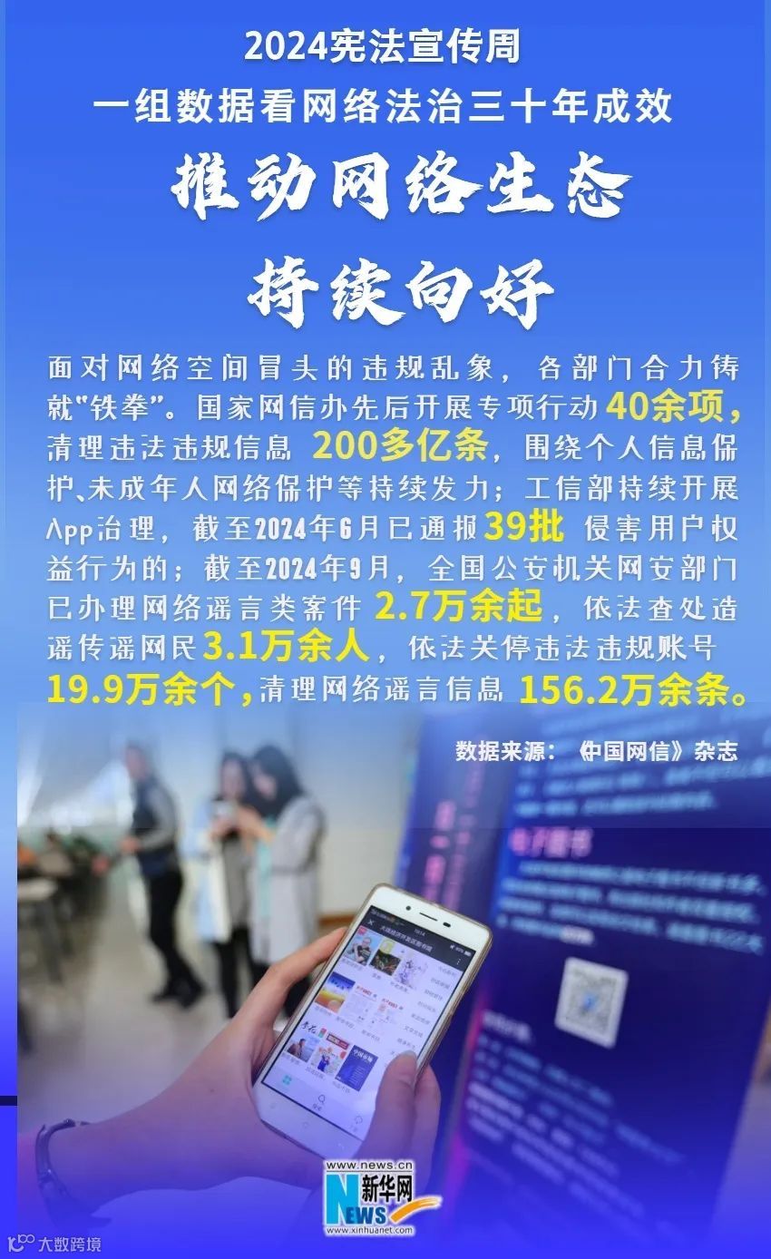 2024年是中国全功能接入国际互联网30周年,也是中国网络法治建设起步30年。正值2024年宪法宣传周,让我们用一组数据带你看我国网络法治建设三十年成效,领略宪法精神如何引领新时代网络法治发展。