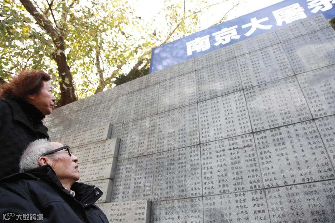 南京大屠杀幸存者余昌祥(右)注目凝视着南京大屠杀中遇难亲人们的名字