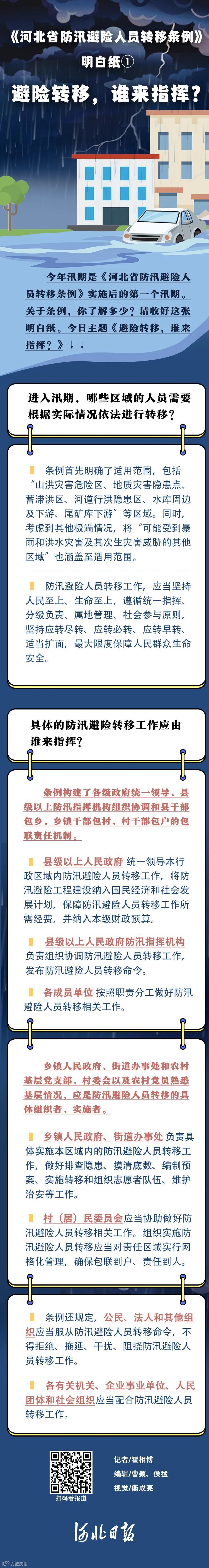 导读:长图 | 《河北省防汛避险人员转移条例》明白纸① 避险转移,谁来指挥?