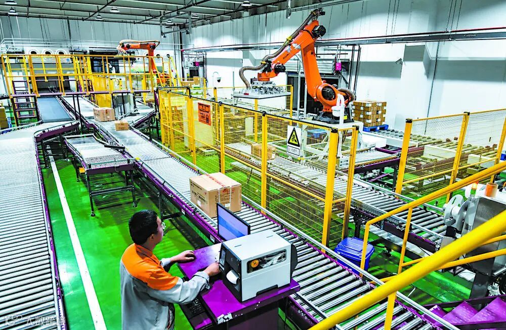 在位于正定高新区的国药乐仁堂物流速递中心,机器人进行货物自动分类打包。