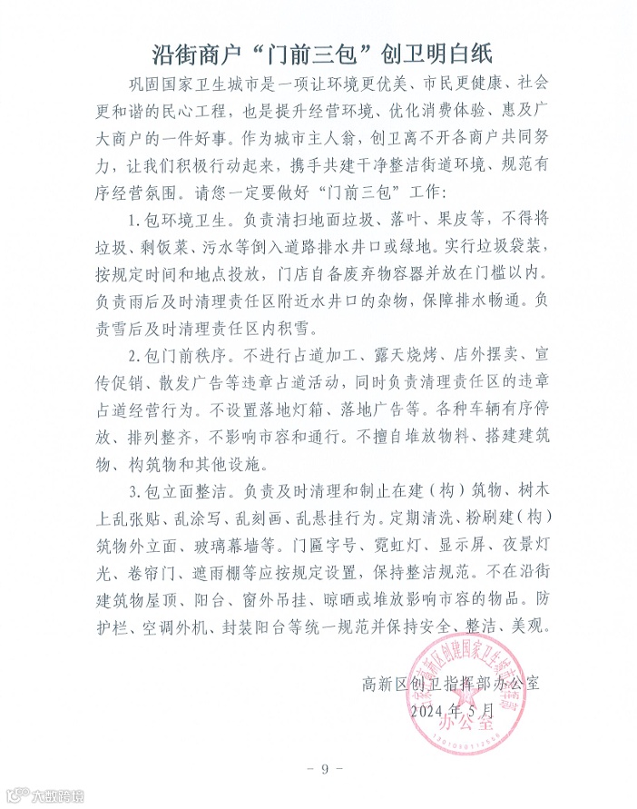 高新区巩固国家卫生城市创卫工作明白纸