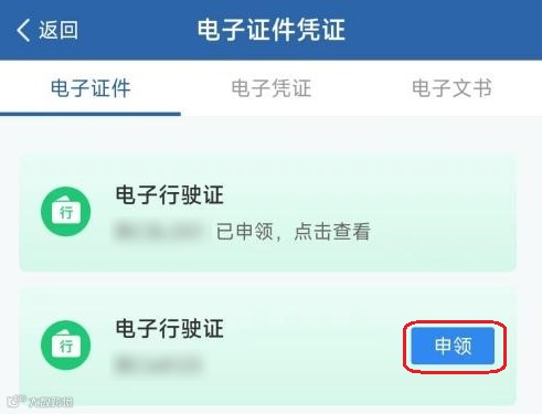 个人用户登录“交管12123”App,点击首页“电子证件凭证”功能,进入“电子证件”子功能。用户名下有机动车的,可点击电子行驶证右侧的【申领】按钮进行申领。