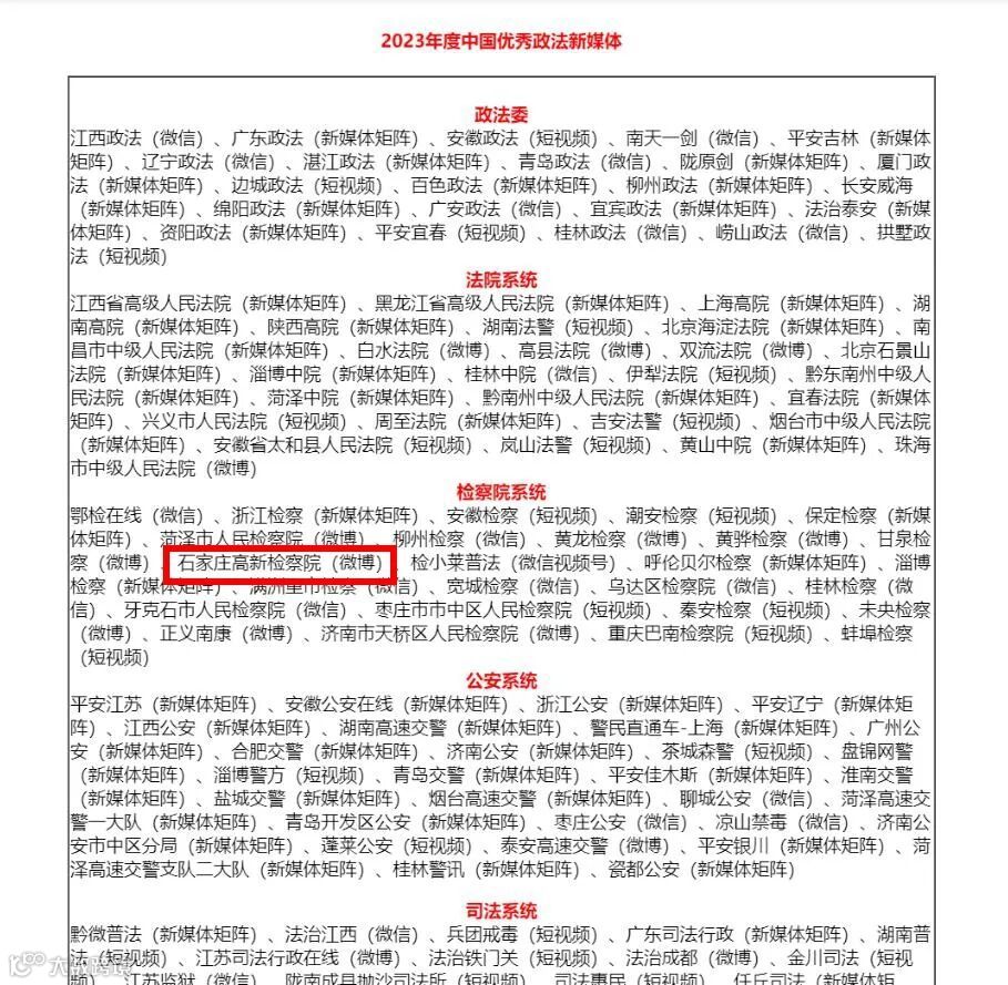 近日,中国信息化研究与促进网(以下简称:促进网)联合国衡智慧移动大数据联盟、太昊国际智库(互联网+AI大数据评估评级)等专业权威机构,通过大数据采集、网络测评、问卷调查、单位自荐、专家推荐、综合评估等方法评选和推荐出2023年度中国最具影响力“互联网+政法服务”平台(包括但不限于政法委、法院、检察院、公安、司法系统网站,微博、微信、头条号、短视频等新媒体)、2023年度中国创新型“互联网+政法服务”平台、2023年度中国智慧政法十佳创新案例(含大数据、人工智能等智慧政法平台)、2023年度中国优秀政法网站、2023年度中国优秀政法新媒体等。其中,石家庄高新检察院(微博)连续8年蝉联“中国优秀政法新媒体”。