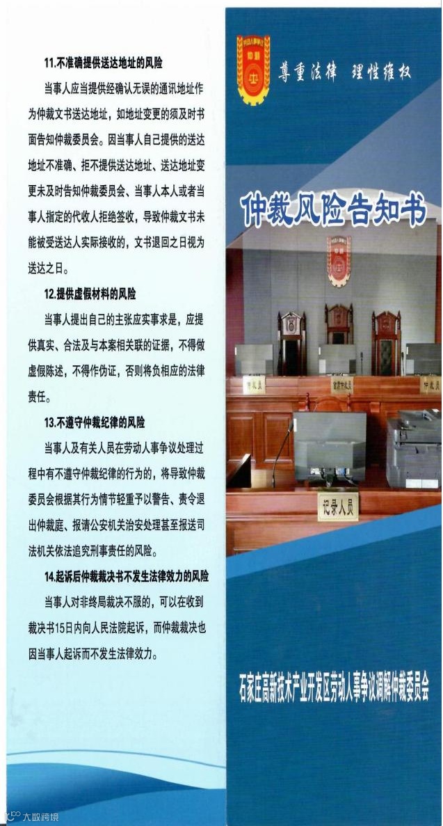 近日,高新区劳动人事争议仲院裁本着“仲裁为民”的服务理念,勇担职责使命,激发干事活力,把初心和民心结合起来,立足眼前,着眼长远,扎实为民办实事解难题,制作并推广了仲裁风险告知书。