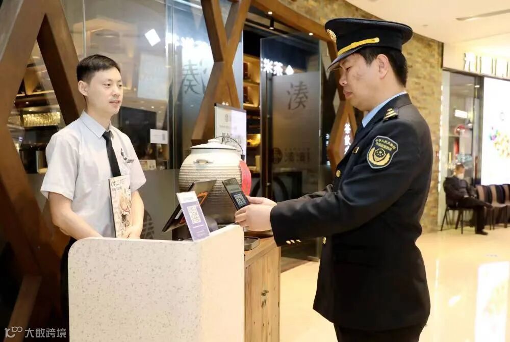 监管员论海根在餐厅门前扫码上传检查结果。新华社记者冯维健 摄