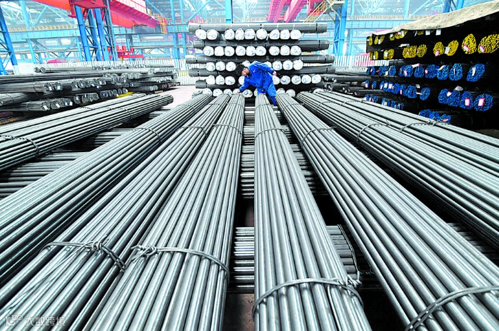 位于石家庄市井陉矿区的河钢集团石钢公司钢材生产线上,工人清点钢材。