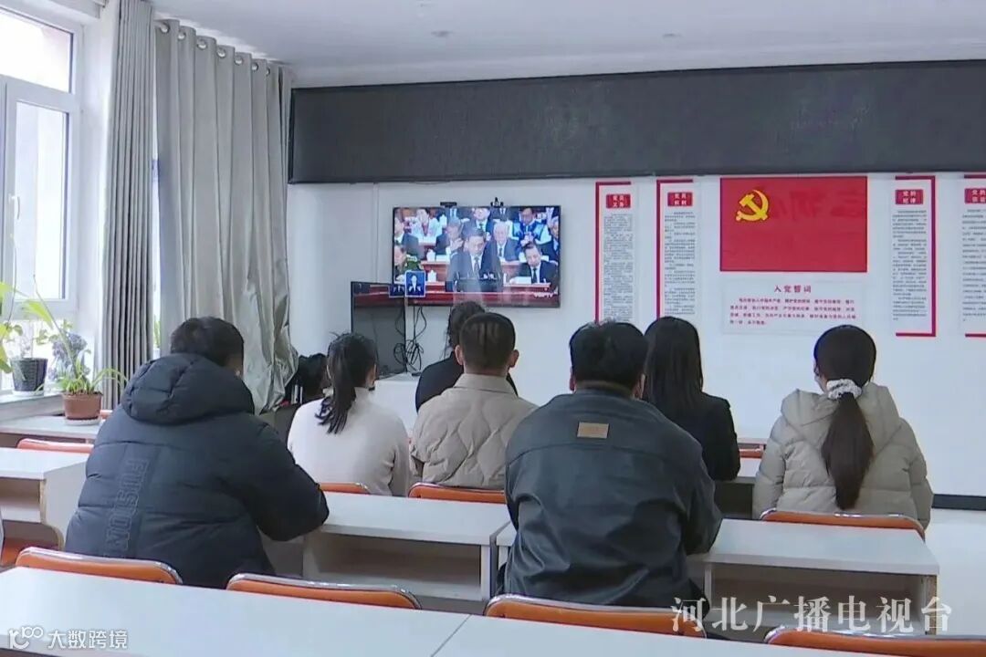 国网高碑店市供电公司组织员工集中收听收看十四届全国人大二次开幕会直播,认真聆听《政府工作报告》。(河北台 魏海超 常琛 贾博 崔凯杰)