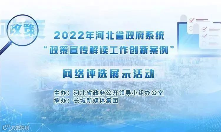 为深入学习宣传贯彻党的二十大精神,打造公开透明、方便快捷、优质高效的政策解读“网红样板”,激励引导全省政府系统加大重大政策文件的宣传解读力度,提升解读质量,不断提升政府公信力、执行力,提高公众满意度、获得感,11月2日起,河北省政务公开领导小组办公室在全省政府系统开展2022年河北省“政策宣传解读工作创新案例”评选活动,各地各部门积极推荐案例参评,经过严格初审,初评出优秀案例60个。12月8日—12月18日,进行专题网络展示和点赞,快来为您心中的创新案例点赞吧!