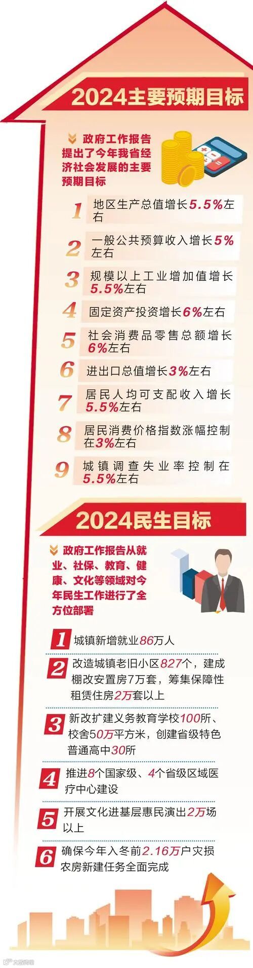坚持以人民为中心,多谋民生之利、多解民生之忧。报告提出,积极发展民生和社会事业,提高人民群众生活品质。坚持尽力而为、量力而行,继续实施20项民生工程,增强人民群众的获得感、幸福感、安全感。报告从就业、社保、教育、健康、文化等领域进行了全方位部署。