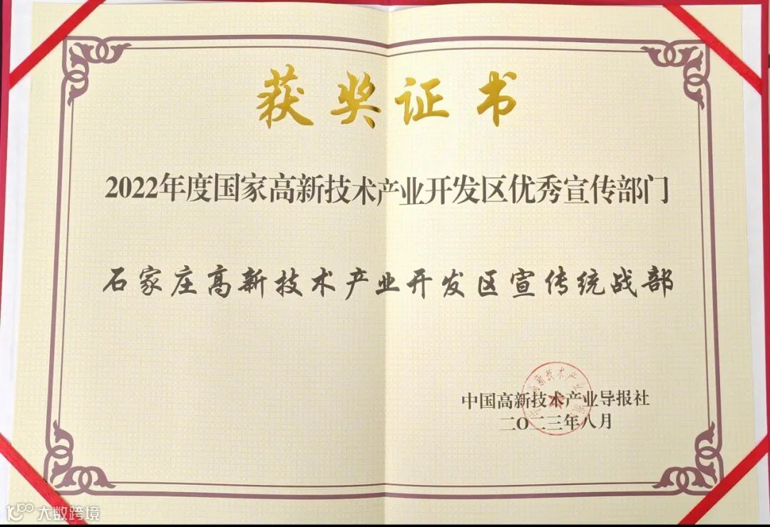 会议对获得2022年度国家高新区优秀宣传部门、优秀微信公众号、优秀新闻作品的单位和个人进行了表彰,并颁发证书。其中区宣传统战部获评优秀宣传部门,“石家庄高新发布”微信公众号获评优秀微信公众号,新闻作品《石家庄高新区:聚焦目标定位努力做好“高”“新”》获评优秀新闻作品。