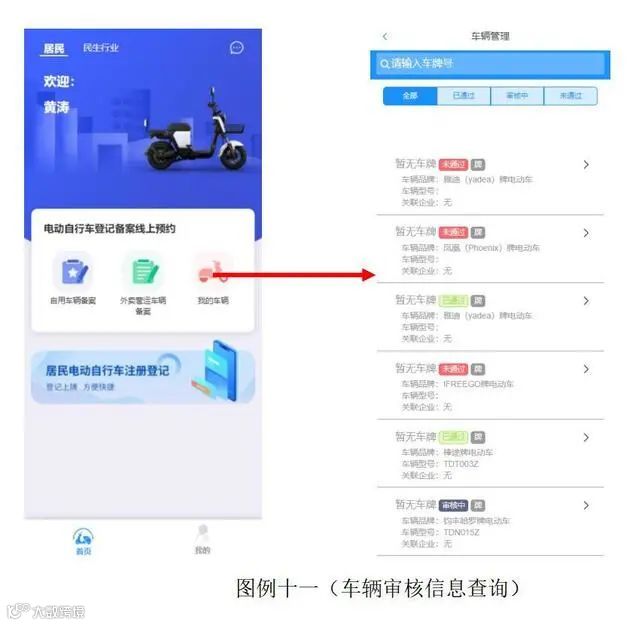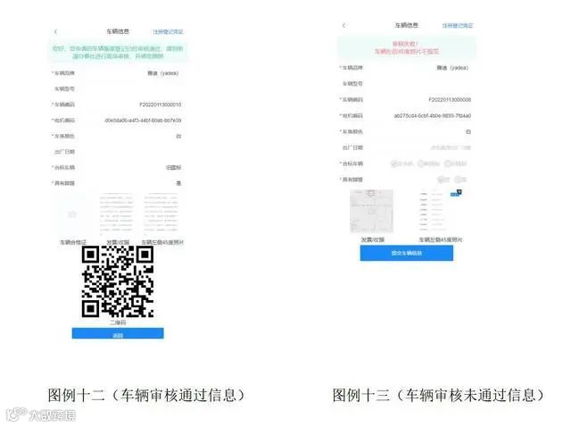 车主登记备案预约信息录入完毕后,平台工作人员对上传的资料进行审核,并短信告知审核结果,审核通过的生成预约二维码。车主可通过“我的车辆”(车辆详情页面)查看车辆相关审核信息。