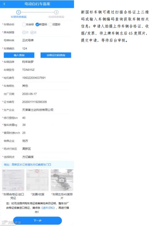 1.对符合强制性国家标准的电动自行车登记注册正式号牌。