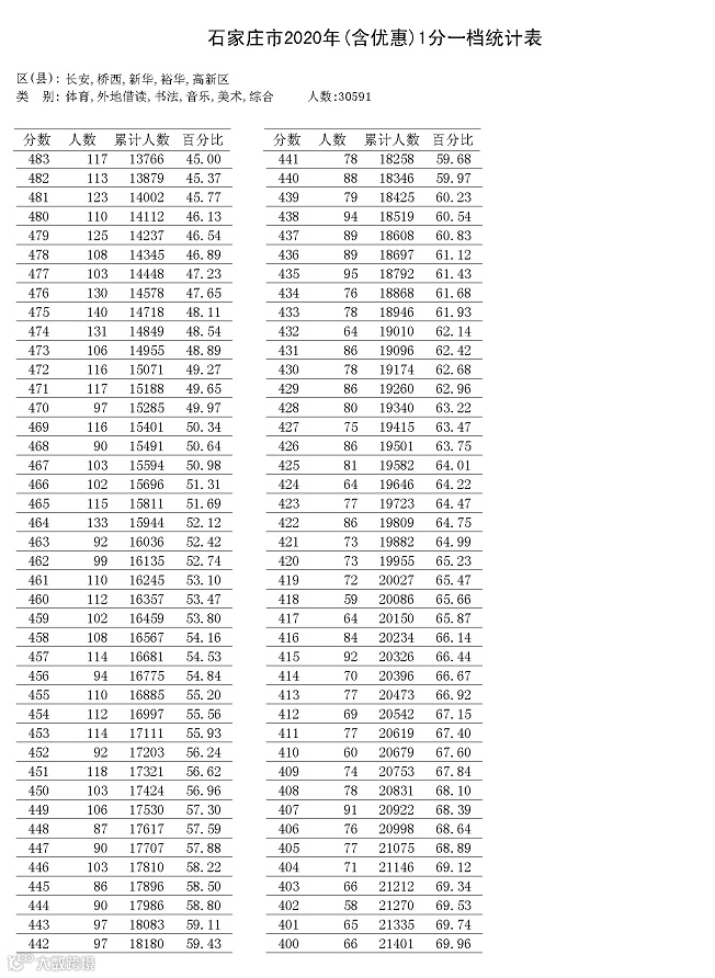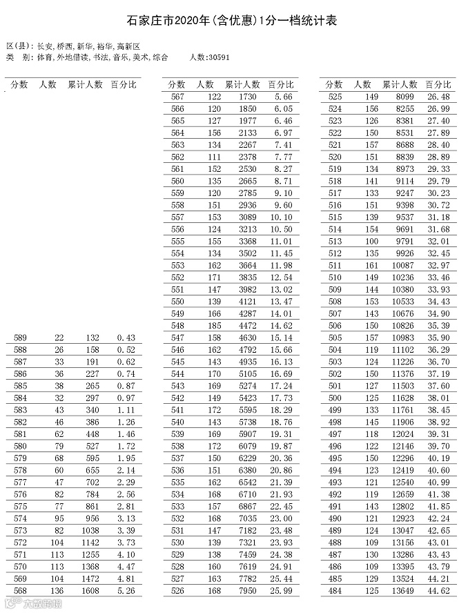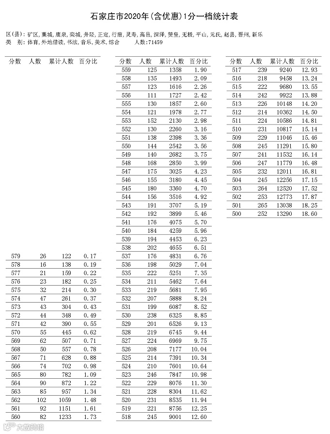 记者今天从石家庄市教育考试院了解到,2020年中考阅卷、划线工作已于7月28日全部结束,今年普通高中录取最低控制分数线市区为415分,1分一档统计表公布↓↓↓