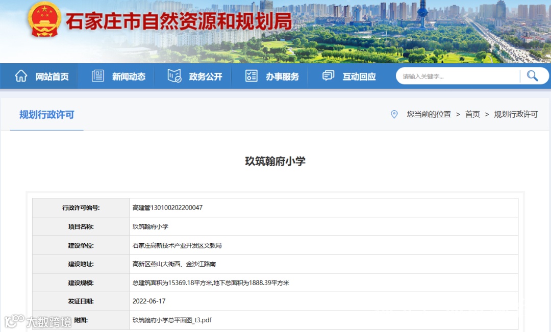 石家庄市自然资源和规划局发放的《玖筑翰府小学建设工程规划许可证(建筑类)》显示,该项目建设地址位于高新区燕山大街西、金沙江路南。