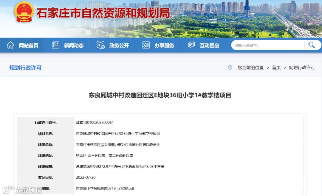 石家庄市自然资源和规划局发放的《东良厢城中村改造回迁区E地块36班小学1#教学楼项目建设工程规划许可证(建筑类)》显示,该项目建设地址为桥西区西三环以东、南二环西延以南。