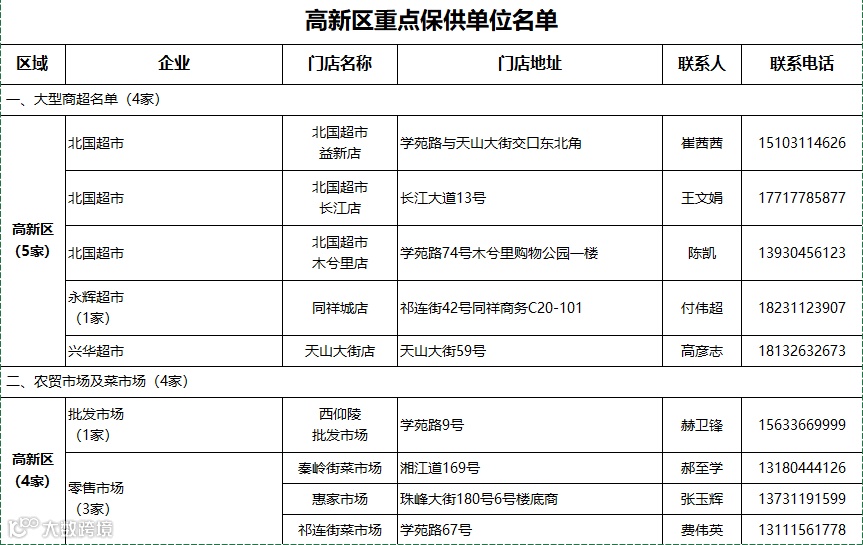 为进一步做好我区当前疫情防控期间市场保供工作,满足区内居民生活需求,保证群众生活物资供应充足稳定。现将高新区重点保供单位名单及小区保供网点予以公布: