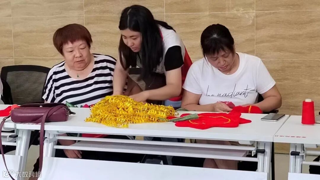 工作人员向社区低收入、未就业人群发放了第一批手绢材料,他们带回家按照