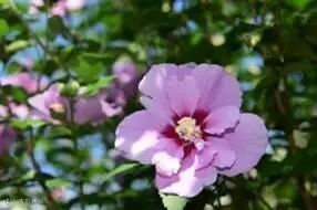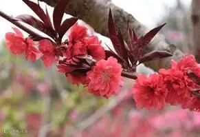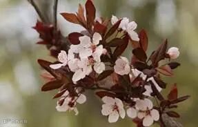 彩叶植物,叶子颜色常年紫红发亮,在绿叶丛中像一株株永不败的花朵。早春淡雅的小粉花,繁花满树,落英缤纷。