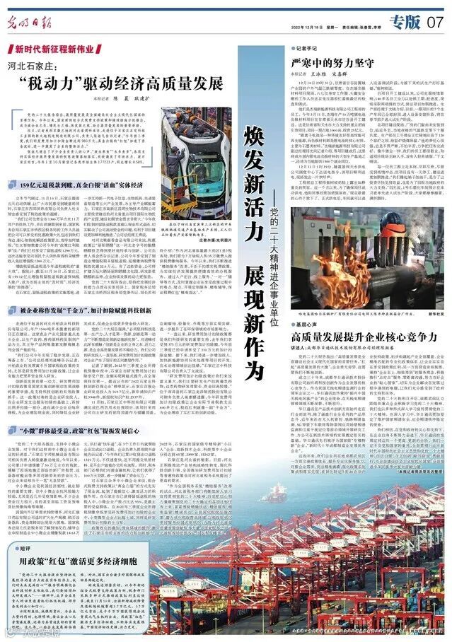 “党的二十大报告提出,支持中小微企业发展。对于我们这样的中小微企业是十足的好消息。”石家庄宇邦机械设备有限公司相关负责人杨俊豪激动地说,今年以来,公司累计申请缓缴了30万元左右的税款,缓解了因场地搬迁面临的新厂房租赁、设备器材搬运等多项花销带来的资金压力,对企业来说相当于一笔“无息贷款”。