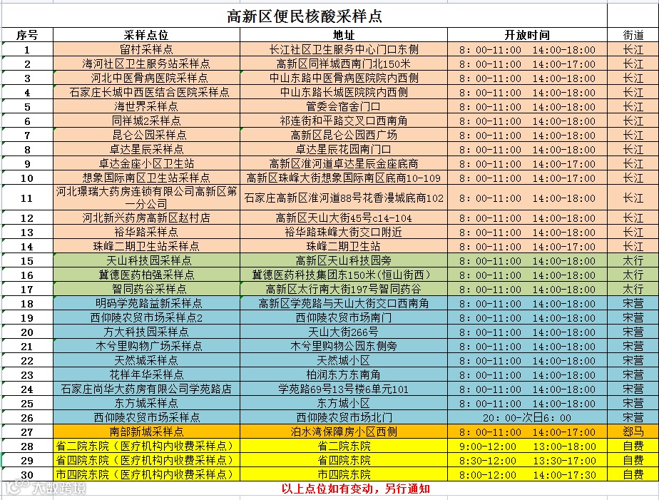 现将核酸检测点名单公布如下,后期名单有变动会另行通知。