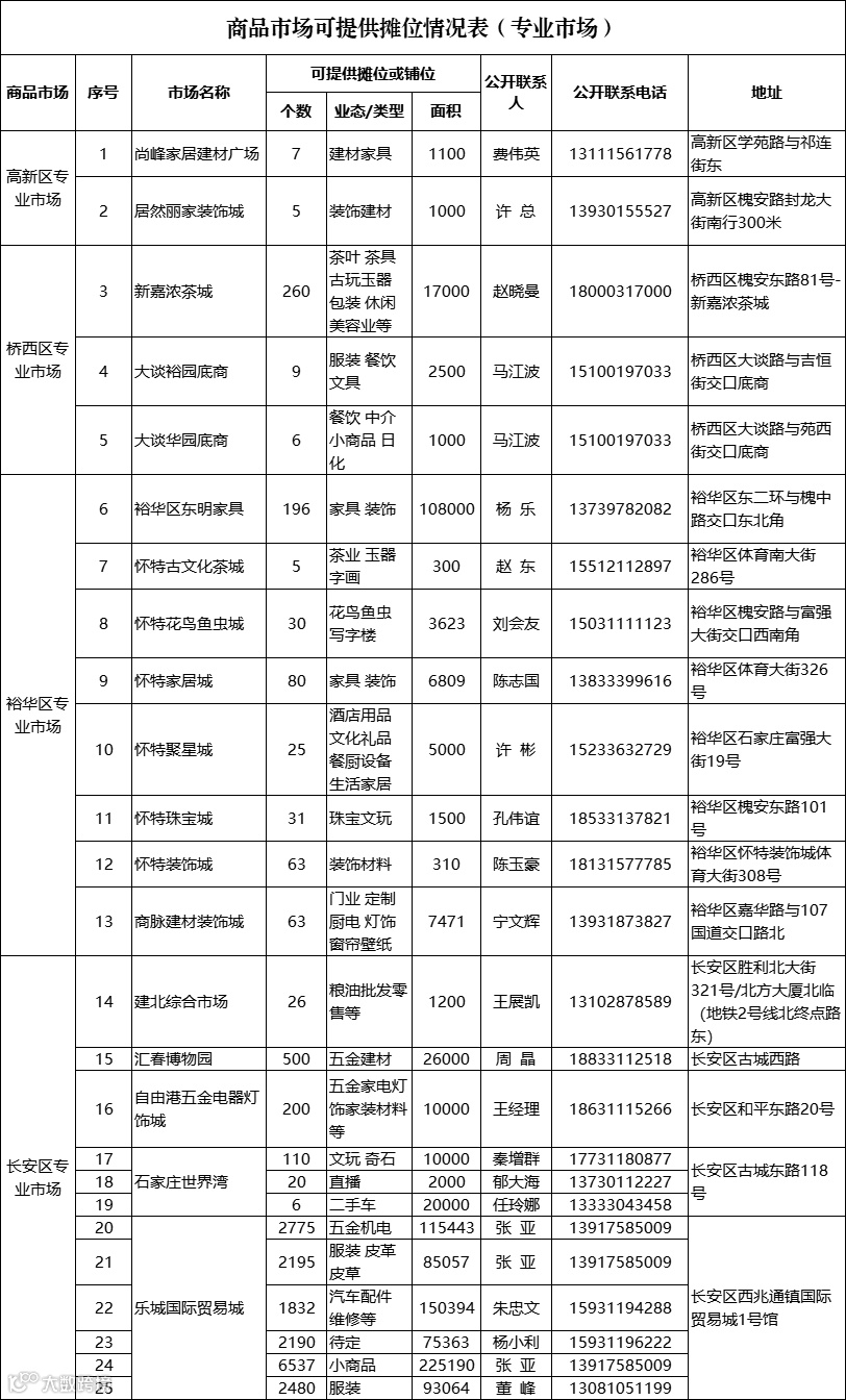为贯彻落实市委、市政府“突出做好稳增长、稳就业、稳物价工作”等有关精神,市商务局强化责任担当,主动服务、牵线搭桥,全市商务系统上下联动,对长安区、桥西区、新华区、裕华区、高新区内的专业市场、农贸市场、菜市场、综合市场等经营场所进行了摸底调查,梳理出一批空余摊位,供商户选择使用。
