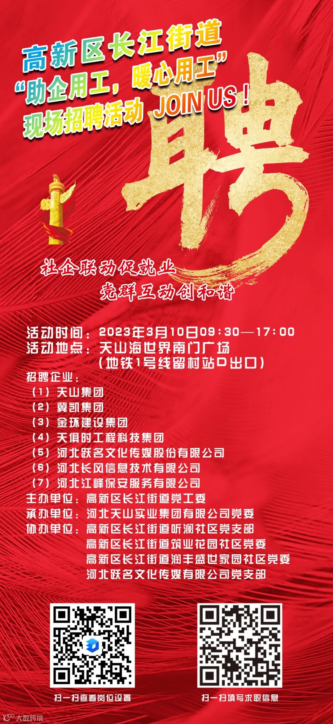 为推动习近平新时代中国特色社会主义思想和党的二十大精神深入人心,展示社区风采,创建文明社区,充分发挥党建引领作用,积极搭建人才交流平台,实现“社区党建”与“非公党建”同频共振,将社区党建与非公党建相结合,打造非公企业和求职群众就业的桥梁,为优秀人才提供就业服务,为非公企业注入新鲜血液。长江街道办定于3月10日(本周五)在石家庄天山海世界南门广场举办“助企用工,暖心用工”招聘活动。