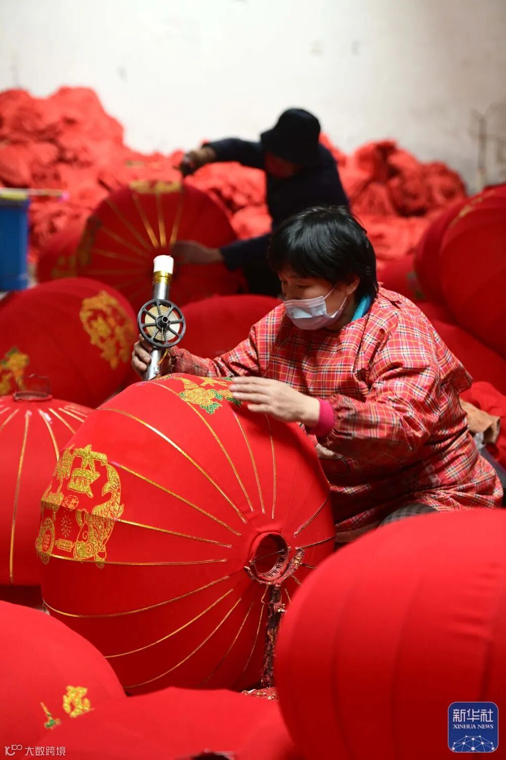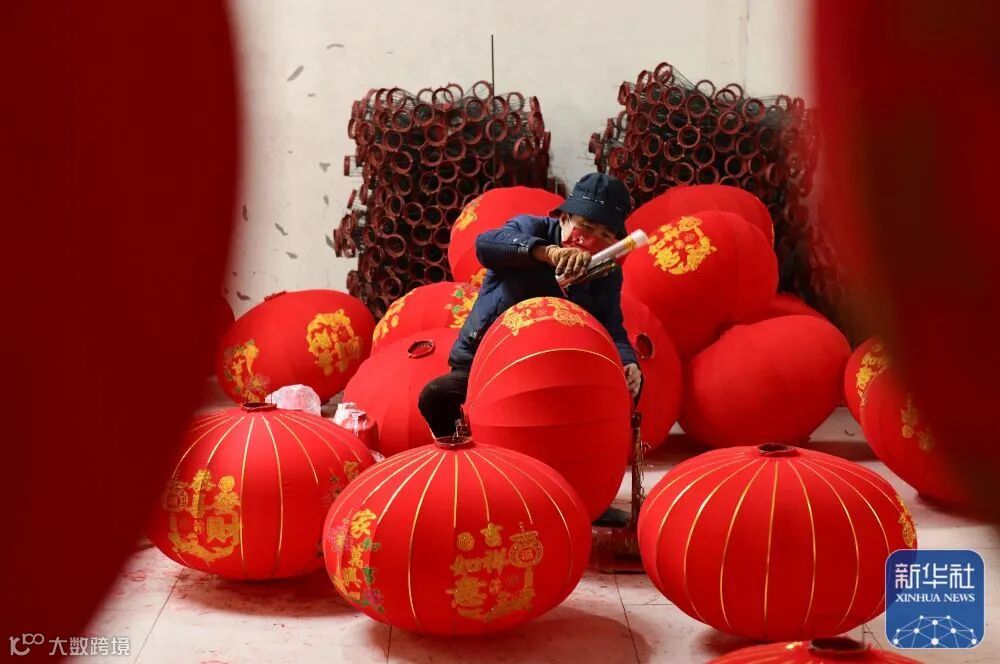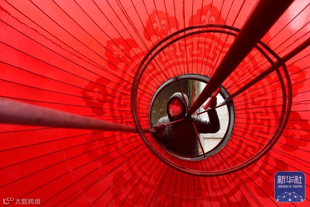 1月5日,在河北省石家庄市藁城区屯头村,一家宫灯企业的工人制作大型宫灯。