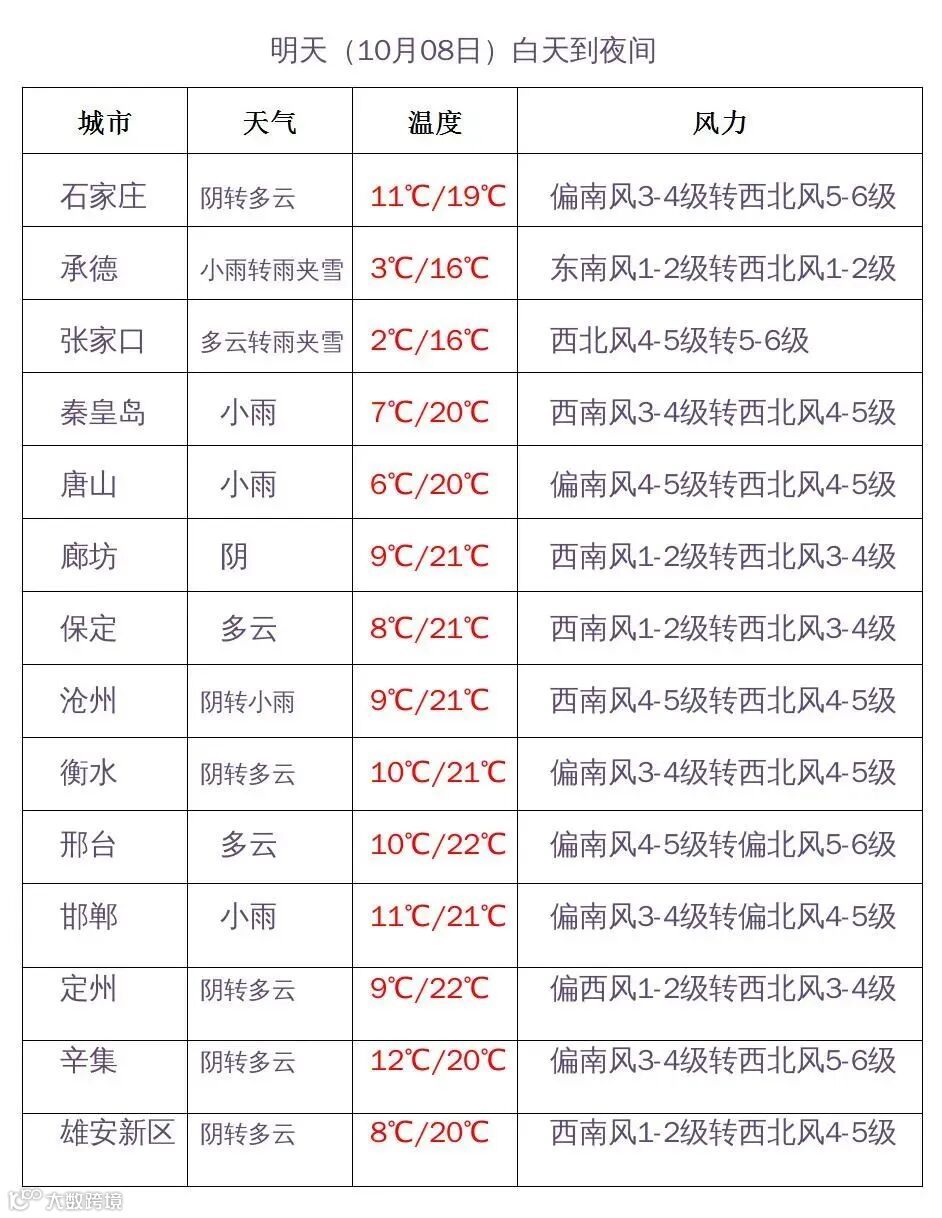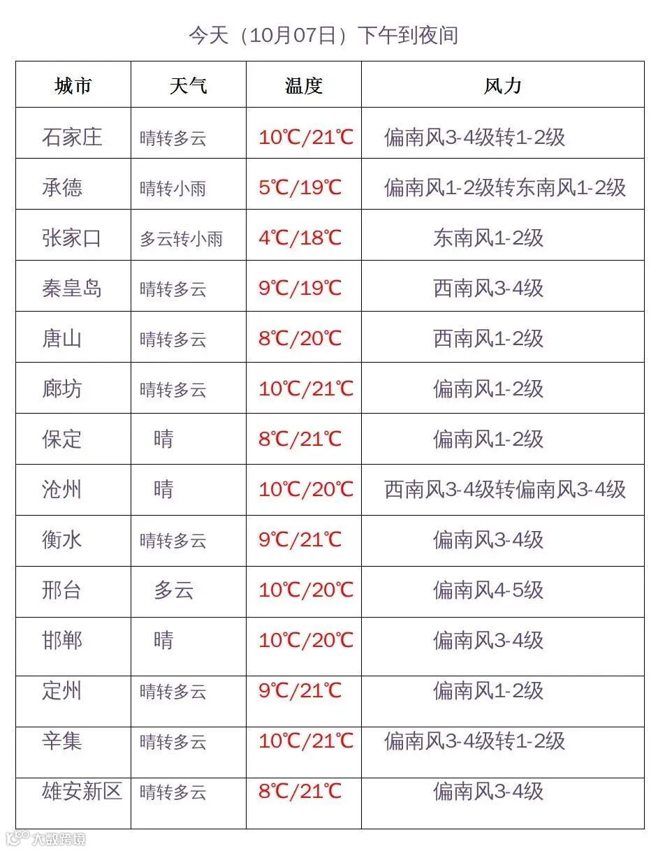 今天下午到夜间,张家口、承德多云转阴有小雨,其他地区晴转多云。最高气温,张家口中北部、承德、保定西北部13~18℃,其他地区19~22℃。最低气温,张家口、承德、保定西北部-1~6℃,其他地区7~11℃。