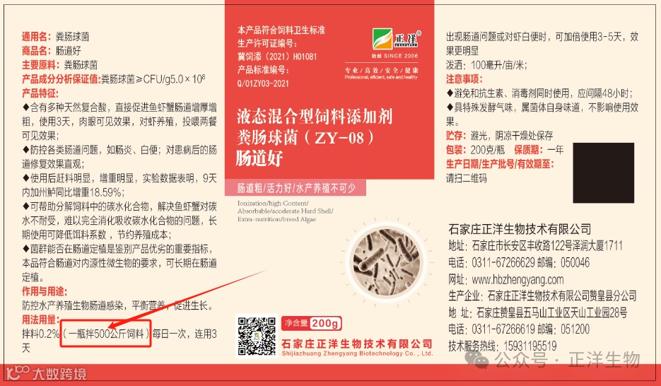 肠道好新包装,由于印刷厂印刷错误,误将用法用量1瓶拌100公斤饲料印刷成1瓶拌500公斤饲料,此错误标签的产品已发往市场,下批产品将会更正,如有不便,敬请大家谅解。