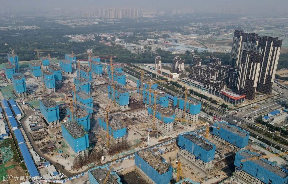 ↑9月28日,中铁二十局的工人在石家庄高新技术产业开发区集中安置区棚户区改造项目H区建设现场施工(无人机照片)。杨世尧 摄